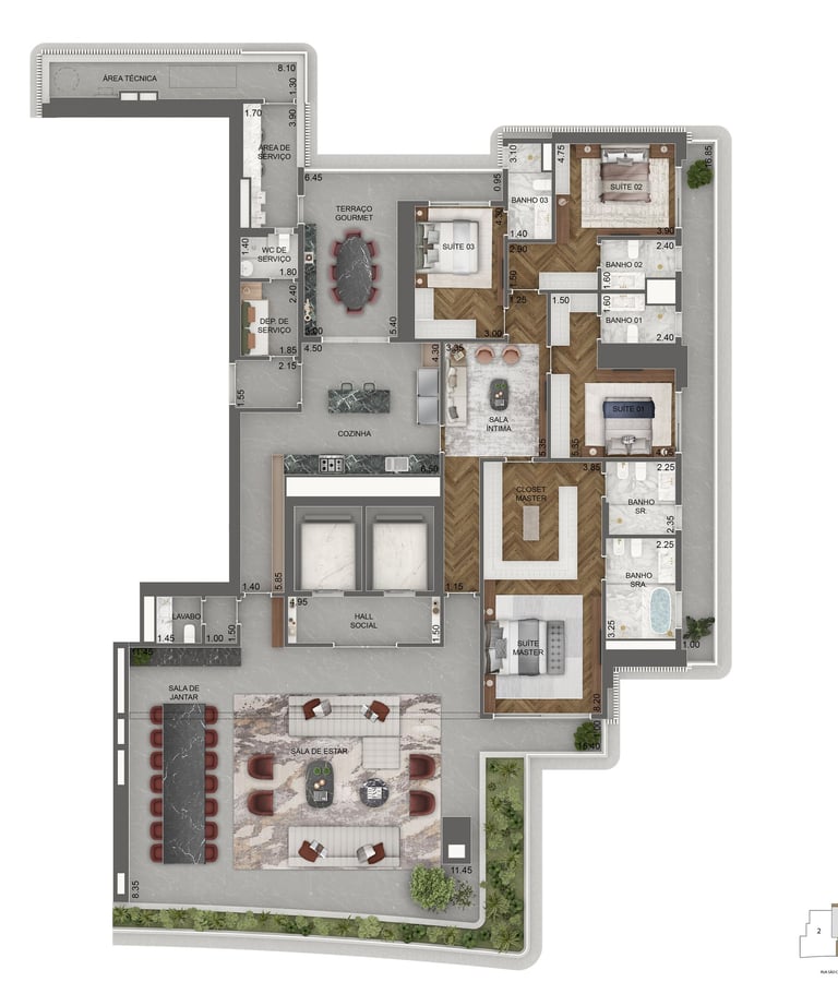 Planta 708 m² | 4 suítes | piso superior